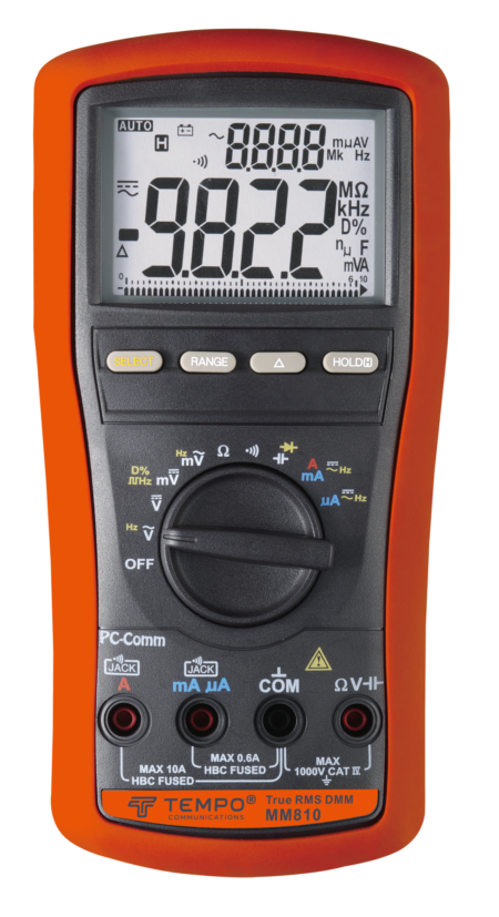 The MM810 from Tempo Communications is an advanced multimeter geared toward professional technicians and electricians. The MM810 is a highly accurate, high precision, True-RMS (TRMS), dual display multimeter with all the measurement features one is likely to need in the field.