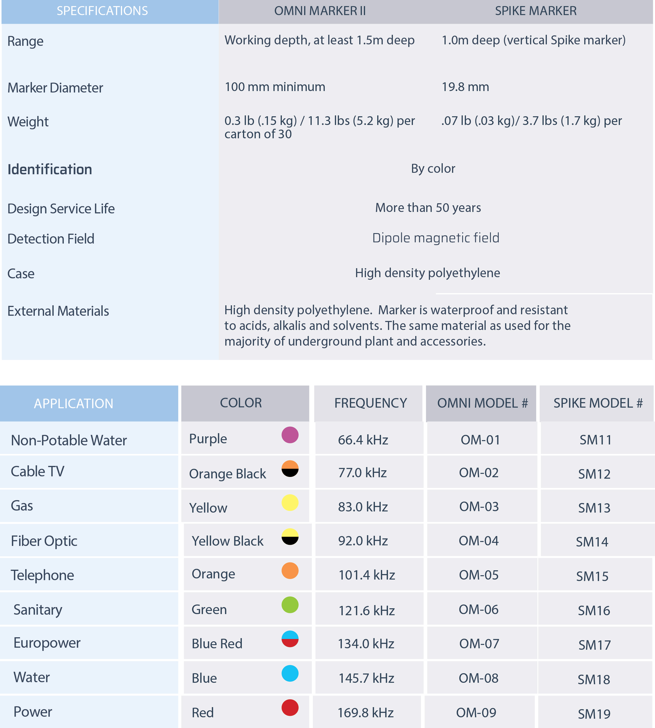 Made of high-density polyethylene, the Spike Marker has a lifetime comparable to the equipment they are buried alongside. Spike Markers are compatible with virtually all marker locators, including the EML-100 from Tempo, and are available with all industry-standard frequencies and color combinations.